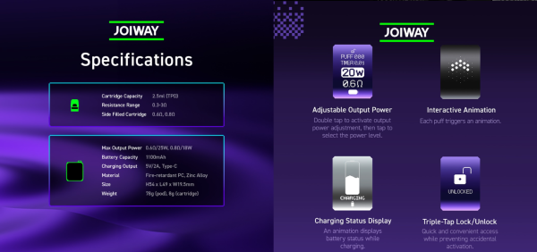 Joiway kembali meluncurkan inovasi terbarunya melalui Joiway X1 Pro Max, sebuah perangkat pod system dengan fitur touch screen yang memberikan kemudahan pengguna untuk mengatur watt dan fungsionalitas lainnya hanya dengan sentuhan.