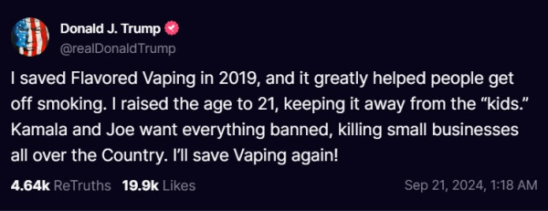 Berita ini diposting oleh Trump di Truth Social, platform media sosial miliknya pada 21 September 2024. Dalam unggahannya, Trump berjanji untuk “menyelamatkan vape” kembali setelah sebelumnya sempat melarang di periode masa jabatannya.
